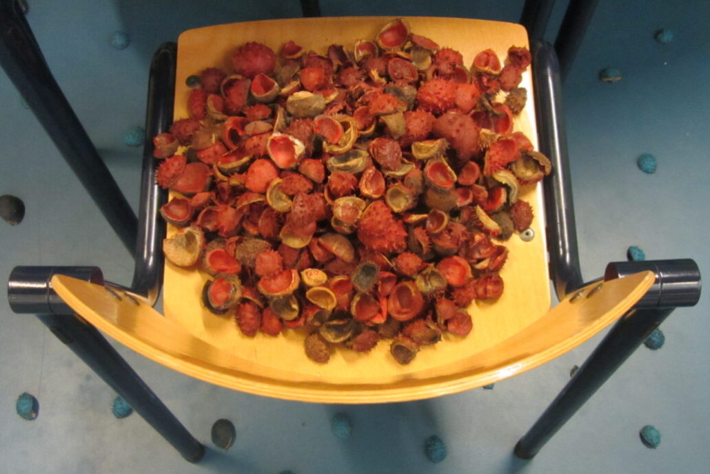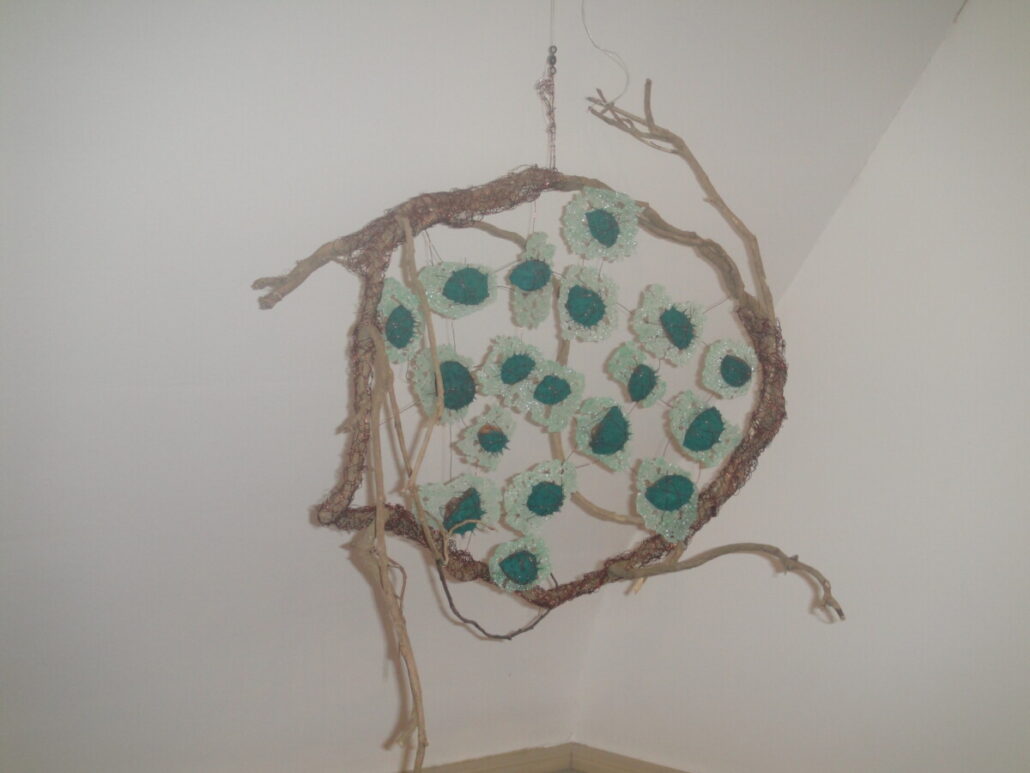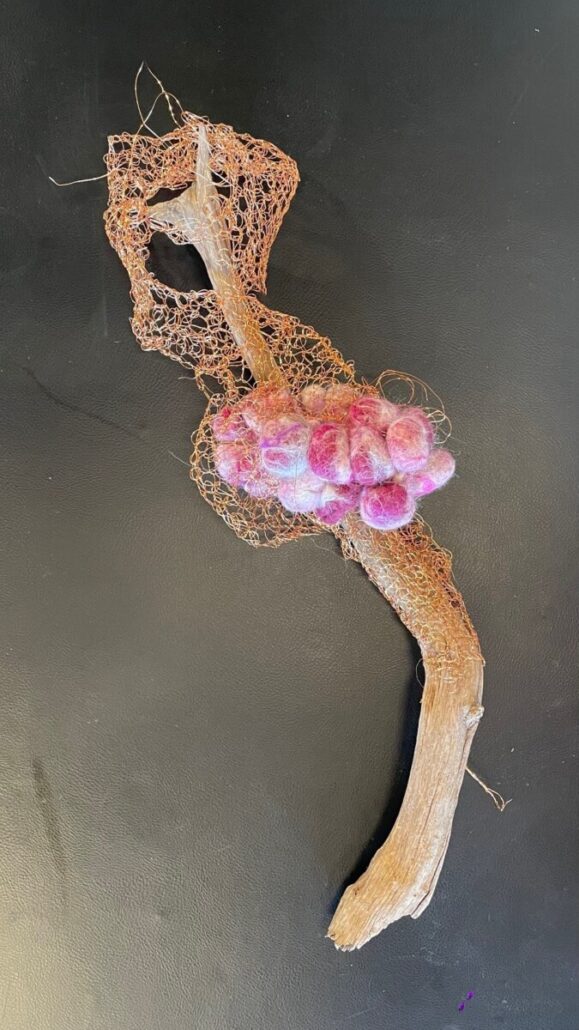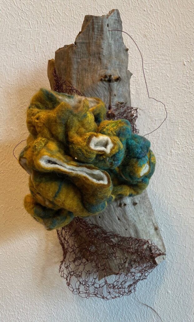 op een subtiele manier wordt een element uit de natuur voorzien van vilt en koperdraad, waardoor een nieuwe schoonheid ontstaat